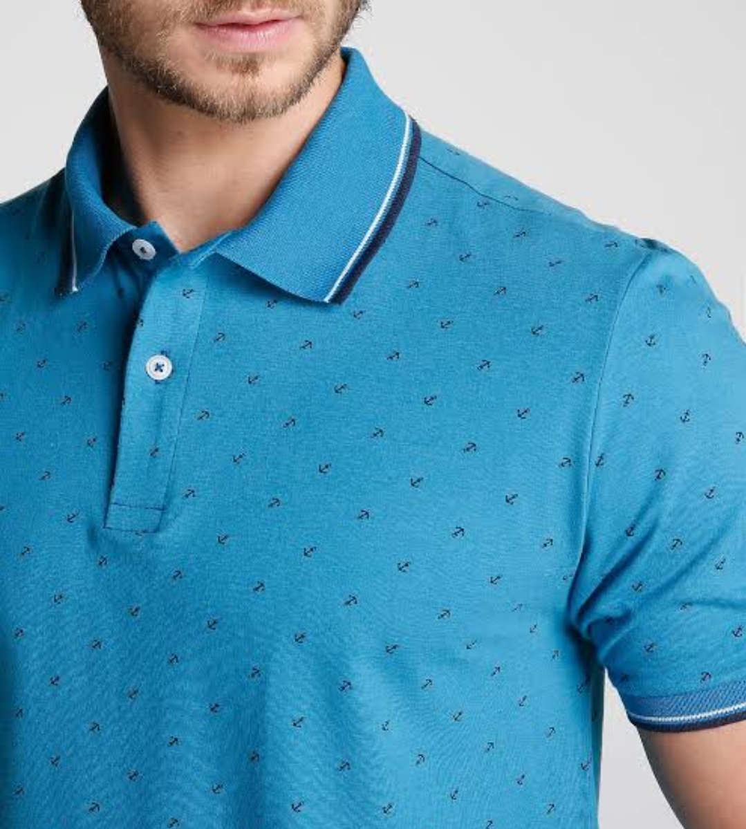 Leve o estilo náutico para o seu dia a dia com esta elegante camisa polo masculina. Confeccionada em tecido macio e respirável, ela apresenta um tom de azul vibrante e detalhes de pequenas âncoras estampadas por toda a peça, trazendo um toque moderno e descontraído. A gola clássica com acabamento em listras contrastantes adiciona sofisticação ao visual, perfeita para compor looks casuais ou um passeio de fim de semana. Possui fechamento frontal com botões e caimento confortável, ideal para diversas ocasiões.